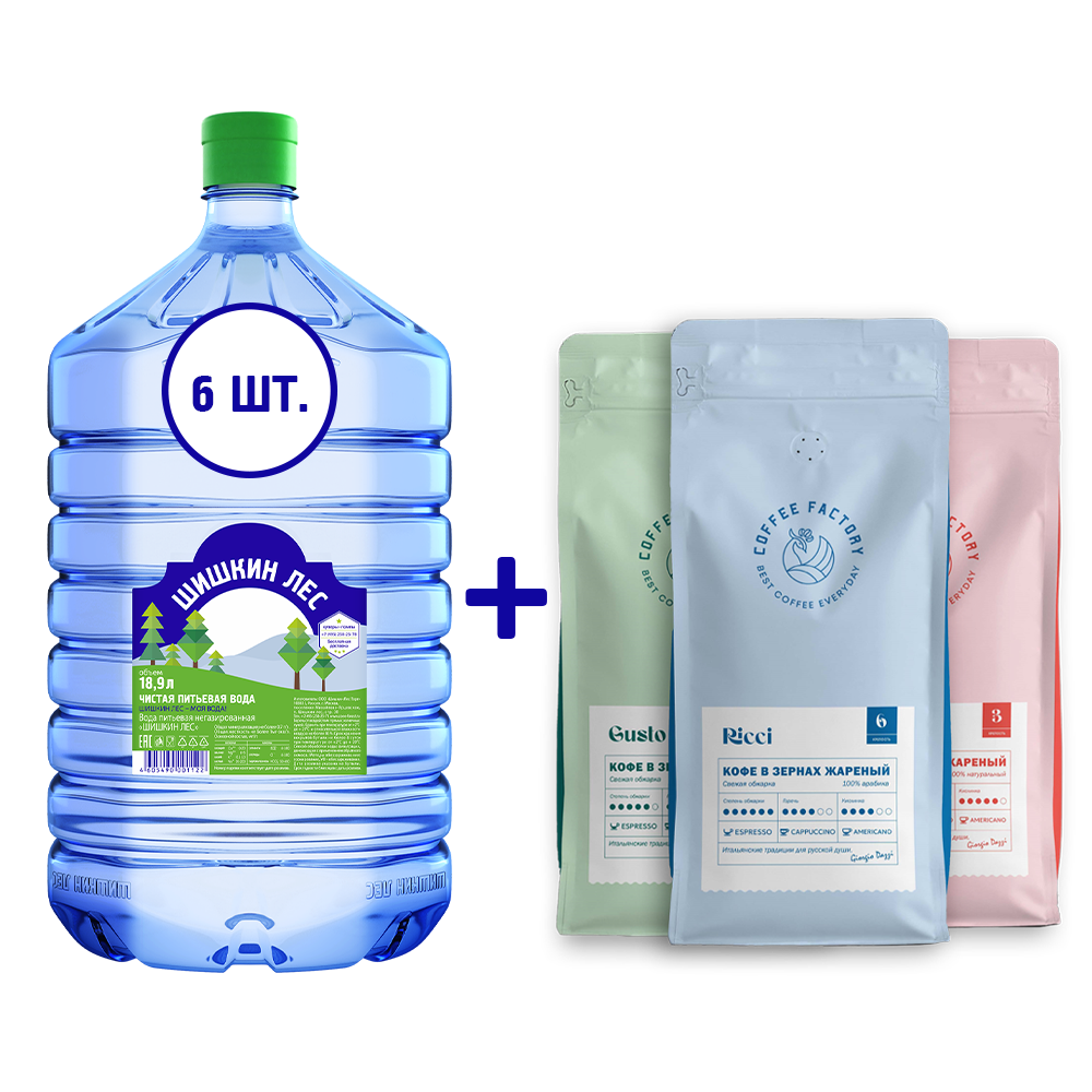 С 1 января по 31 марта 2026 года при покупке 6 бутылей воды «Шишкин Лес» 18,9 литров (ПЭТ) + упаковки на 1 килограмм любого зернового кофе Coffee Factory на нашем сайте, через приложение «ШИШКИН ЛЕС ДОСТАВКА» или через оператора по телефону +7 (495) 258-2578 предоставляется скидка 15 % на набор*.