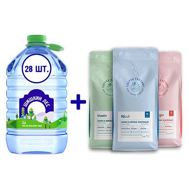 10% скидка при покупке 28 бутылок воды «Шишкин Лес» 5 литров и упаковки 1 кг любого зернового кофе Coffee Factor