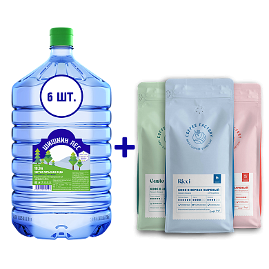 15% скидка при покупке 6 бутылок воды «Шишкин Лес» 18,9 литров и упаковки 1 кг любого зернового кофе Coffee Factor